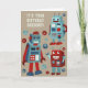 Créez une carte d'anniversaire personnalisée pour un garçon d'anniversaire spécial. Cette carte est prête à être personnalisée avec votre propre texte personnalisé à l'avant et à l'intérieur. Le message sur le devant dit : C'EST VOTRE ANNIVERSAIRE, NOM ! Et le message à l'intérieur dit : DONC, FAIS DES NUTS ! JEUX ANNIVERSAIRE ! Mais tout le texte peut être changé en votre propre texte personnalisé. Cette carte présente de jolies illustrations de robots de style rétro dans les tons rouge et bleu, ainsi que des graphiques en écrou hexadécimal coordonnés contre un arrière - plan bronzé.