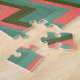 Puzzle avec un gorille à l'air drôle et suspect regardant de derrière une couverture dessinée dans un motif en chevron rose et vert zigzag.