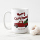 Funny mug with old red truck and Christmas tree . Old vintage Chevy truck hauling a Christmas tree. Fun coffee cup design for the holidays. Personalize with your own custom text and colors.