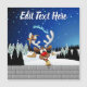 A Funny cartoon reindeer with a bright red nose and large white antlers, adorned with a red and gold bow, peeks through an open window. Outside, a snowy landscape with silhouetted pine trees and a small, glowing house is visible under a dark blue, star-filled night sky. Santa's sleigh pulled by reindeer is flying in the distance. The scene evokes a festive and whimsical Christmas atmosphere. Original Vector Art Copyright BluedarkArt TheChameleonArt.