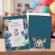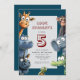 Rouler dans une fantastique célébration de 5ème anniversaire avec cette drôle d'invitation d'animaux safari! Ce design accrocheur présente une collection de créatures safari hilarantes et amicales, dont un singe branché, une girafe et un crocodile étincelant, prêt à faire la fête. Les oeuvres d'art animées et les couleurs audacieuses capteront l'attention de tous vos invités et créeront une ambiance ludique pour l'événement. C'est la façon idéale pour les amis et la famille invitations de célébrer le cinquième anniversaire de votre enfant avec style et plaisir.