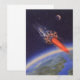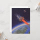 Illustration vintage de l'espace extra-atmosphérique et des planètes futuristes, image de science-fiction. Un vaisseau spatial de voyage et de transport fusée traversant l'espace en vol au-dessus de la terre avec la lune au loin. Un design rétro classique des années 50 de bande dessinée sci-fi du futur.