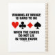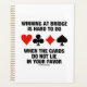 Peu importe la fréquence ou le peu que vous jouez au jeu de bridge, si vous êtes un joueur de bridge, vous apprécierez ce faux mot de bridge disant "Gagner au pont est difficile à faire lorsque les cartes ne mentent pas en votre faveur", ainsi que les quatre costumes de carte. Faites faire aux autres une double prise au numéro un de la difficulté à gagner au pont (pont dupliqué) avec cet humour de pont mémorable disant planificateur!