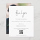Script QR Code Galerie de photos Mariage Merci. Un prix économique PETIT 4,5 po x 5,6 po alternatif. Disponible dans un STOCK SEMI-GLOSS 110 lb CARD qui est l'option par défaut (plus épais pour les invitations), OU un STOCK SATIN FINISH 80 lb THINNER PAPER (idéal pour les boîtiers). Les enveloppes sont en option et légèrement plus grandes que la taille de la carte. Un design minimaliste de typographie avec un ensemble de style design d'écriture manuscrite pour le Merci. Sur le dos, remplacez l'exemple de photo par votre préféré de la journée comme souvenir pour vos invités. Personnalisez facilement le reste du texte avec votre message et vos noms et remplacez l'exemple de code QR par votre propre menant à votre galerie photo mariage en ligne.