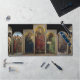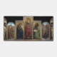 Le Retable de Gand (ou l'Adoration de l'Agneau Mystique, Néerlandais : Dieux Het Lam) est un grand et complexe retable polyptyque du XVe siècle dans la cathédrale St Bavo, Gand, Belgique. Il a été commencé vers le milieu des années 1420 et achevé avant 1432, et est attribué aux peintres et frères flamands primitifs Hubert et Jan van Eyck. Le retable est considéré comme un chef-d'oeuvre de l'art européen et l'un des trésors du monde. Les panneaux sont organisés en deux registres verticaux, chacun avec deux ensembles d'ailes pliables contenant des tableaux intérieurs et extérieurs. Le registre supérieur des panneaux intérieurs représente la rédemption céleste, et comprend la Deësis centrale du Christ Roi (ou peut-être Dieu le Père), la Vierge Marie et Jean Baptiste. Ils sont flanqués dans les panneaux suivants par des anges jouant de la musique et, sur les panneaux les plus lointains, les figures d'Adam et Eve. Les quatre panneaux à registre inférieur sont divisés en deux paires : des peintures en grisaille sculpturales de Saint Jean le Baptiste et de Saint Jean l'Évangéliste, et sur les deux panneaux extérieurs, des portraits de donateurs de Joost Vijdt et de sa femme Lysbette Borluut. Le panneau central du registre inférieur montre un rassemblement de saints, de pécheurs, de clergé et de soldats accompagnateurs à une adoration de l'Agneau de Dieu. Il existe plusieurs groupes de figures, supervisés par la colombe du Saint-Esprit. Le retable est l'une des oeuvres d'art les plus célèbres et les plus importantes de l'histoire européenne. Citation : Wikipedia