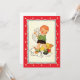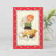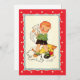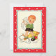 Illustration vintage enfant avec un mignon enfant blonde secourant un chaton de deux chiens de chiot sauvages qui courent autour de ses jambes et se poursuivent l'un l'autre. Antique éphémère avec une bordure rouge décorative aux coeurs.
