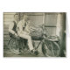 Cette carte comporte une photographie vintage des années 1930 de deux hommes, d'un garçon, et d'un ours de nounours posant sur une motocyclette. Masquez à l'intérieur.