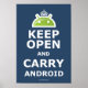 Faites votre déclaration sur les systèmes d'exploitation open source en choisissant Android comme votre système d'exploitation mobile de choix. Cette affiche frappante dit, "Garder ouvert et porter Android" et contient la mascotte Android en vert sur un arrière - plan bleu. Cela rappelle les vieilles affiches de propagande "Keep Calm and Carry On" produites par le gouvernement britannique en 1939 au début de la Seconde Guerre mondiale, destinées à remonter le moral du public britannique en cas d'invasion.