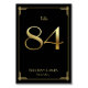 Cartes de numéro de table du mariage Great Gatsby Art Déco avec le numéro d'or 84 et le texte modifiable, où vous pouvez ajouter vos noms et la date du mariage, imprimé sur arrière - plan noir
