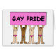 Quatre caricaturistes en sous-vêtements roses brandissant une pancarte rose disant "Gay pride". L'image a un arrière - plan blanc immaculé.