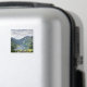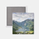 Carré souvenir photo aimant du célèbre fjord Geirangerfjord, un bateau de croisière et le village de Geiranger entre les montagnes de Norvège.