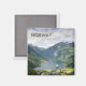 Photo souvenir carré aimant du célèbre fjord Geirangerfjord, un paquebot de croisière et le village de Geiranger entre les montagnes en Norvège avec le texte : 'NORWAY, Geirangerfjord'.