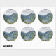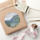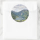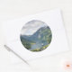 Autocollant rond du célèbre fjord Geirangerfjord, un bateau de croisière et le village de Geiranger entre les montagnes de Norvège.