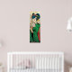 Geisha 芸 affiche 者japonaise à long imprimé vertical, avec une Geisha habillée en vert avec son ventilateur à main, des fleurs sur la tête et des feuilles de parchemin brun sur arrière - plan grunge brun.