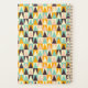Geometric pattern of multi-colored triangles in teal, orange, cream, brown, and peach, arranged in a repetitive grid, conveying a modern, vibrant feel.
