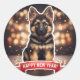Majestic German Shepherd puppy sitting proudly with sparkling lights and golden confetti around. Photorealistic, bright, and festive Happy New Year sticker.