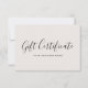 Create a stylish and professional Gift Certificate for your business. This editable design features modern script typography and a minimalist aesthetic. Personalize the template with your company name and contact information. Space is provided for handwritten details such as recipient's name, gift giver, value, issue date, expiry date, and voucher code. It offers fully customizable text to fit your unique business needs. This elegant design is ideal for various businesses, including makeup artists, hair and beauty salons, massage therapists, stylists, boutiques, small businesses and many others. Printed colors: pale beige, off-white, black and white, or customize the color to align with your brand.
