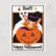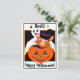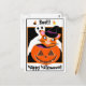 Le gingembre est un chat de dessin animé orange dans un adorable costume de sorcière noir & violet, avec un casquette pointu et un manteau. Elle est assise à l'intérieur d'un valet ou d'une lanterne. Un fantôme blanc flotte derrière elle. Trick ou Treat ! L'arrière - plan peut être n'importe quelle couleur.