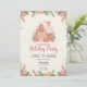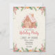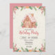 Deliciously sweet Christmas invitation centered around a charming pink gingerbread house decorated with candy details, surrounded by peppermint swirls, orange slices, pine branches, and festive sweets. Perfect for cookie decorating parties, children's Christmas events, or baking-themed holiday celebrations with a sugary, whimsical touch.