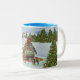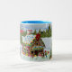 Mug Coloré Deux Tons Avec Grand Bonbons Décoré Maison En Pain D'Épice Entourée De Arbres De Noël, Sous Le Regard D'Une Père Noël Alpine Vieux Monde.