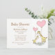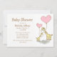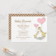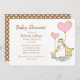 Invitation baby shower élégante faite en blanc, avec des oeuvres de mamma et de petites girafes tenant des ballons de coeur roses. Le dos de l'invitation est fait en brun avec des pois blancs. Personnalisez tout le texte personnalisé en fonction de vos besoins.