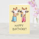 Carte de voeux dessinée à la main avec l'image de deux girafes du cou avec des marques de fourrure blanche et brune, portant des foulards (foulard bleu sur la girafe gauche et foulard rose sur la girafe droite), et une girafe sortant sa langue. "Joyeux anniversaire !" écrit à la main en majuscules ci-dessous.