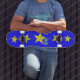 Jolies petites étoiles jaunes portant une fleur pleine numéro 10 pour le dessin d'un skateboard d'anniversaire de fille. Une idée cadeau très spéciale pour cette fille de 10 ans qui adore patiner. Design original par Anura Design Studio.