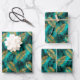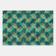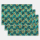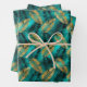 Feuilles de papier d'emballage en verre avec un motif d'or et de feuilles de palme noir sur un arrière - plan turquoise vert faux feuille.