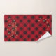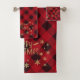 Joli ensemble de serviettes de bain de Noël dispose d'un arrière - plan rouge festif, flocons de neige doré glitterie, une typographie de la glitterie or Joyeux Noël et feuilles d'arbre.