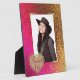 Plaque photo couleur rose et or glamour, avec des images de cadres photo couleur or sur trois coins de la photo personnalisée. Les graphiques d'un coeur de parties scintillant doré décorent le coin inférieur gauche de la photo, avec texte personnalisé rose lisant Sweet 16. Personnalisez la photographie et le texte selon vos besoins.