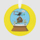 Illustration d'un mignon globe de neige avec un oiseau-noir chantant sur le sommet d'une maison d'oiseaux sainte accrochée à une branche avec des boules de noël colorées dans un paysage enneigé et des pins. Ce dessin animé est une idée cadeau pour les amateurs de Noël ou de Noël et les amateurs de vacances d'hiver.
