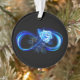 Luminous infinity symbol with glowing, beautiful, lushly blooming rose made of blue flames on black background.