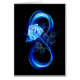 Luminous infinity symbol with glowing, beautiful, lushly blooming rose made of blue flames on black background.