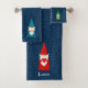 Des gnomes de Noël tenant coeur, lampe magique et cadeau sur arrière - plan bleu. Idéal pour la saison de Noël ! Texte seulement sur une grande serviette.