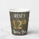 This elegant and opulent birthday themed paper cup design features a personalized name and the message “12th Birthday Party”. The large number “12th” features an imitation/faux gold-inspired coloring pattern, the words “Birthday Party” are in fancy script-style text, and the background has an imitation/faux woodgrain-inspired pattern. Ornate, luxurious paper cups like this might be used at a birthday party being held to honor somebody’s twelfth birthday. [~Z0000568]