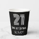 Ce design de tasse en papier à thème d'anniversaire, inspiré et vintage de Roaring Twenties, comprend un grand numéro de style Art déco "21", en plus du message de voeux d'anniversaire "Happy 21st Birthday," et un nom personnalisable. L'arrière - plan est noir de couleur. Des tasses de papier comme celle-ci peuvent être utilisées à une fête d'anniversaire pour quelqu'un qui célèbre son vingt et unième anniversaire. [~Z0000542]
