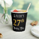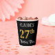 This opulent and fancy birthday-themed paper cup design features an editable name and the message “27th Birthday Party”. The large number “27th” has an imitation/faux gold-inspired coloring pattern, the words “Birthday Party” are in elegant script-style text, and the background is colored black by default (although it can be customized). Luxurious, elegant paper cups like this might be used at a birthday celebration being held to honor somebody’s 27th birthday. [~Z0000567]