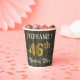 This fancy and ornate birthday paper cup design features a personalized name and the message “46th Birthday Party”. The large number “46th” has an imitation/faux gold-inspired coloring pattern, the words “Birthday Party” are in opulent script-style text, and the background features a faux/imitation woodgrain-inspired appearance. Luxurious, elegant paper cups like this might be useful to have at a birthday celebration being held to celebrate somebody’s forty sixth birthday. [~Z0000568]