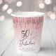 Élégante et chic tasses personnalisées à 50e anniversaire avec "50 & Fabulous" écrit dans un script élégant contre un arrière - plan rose et sombre, avec parties scintillant en or rose et rose qui coule du haut. Personnalisez avec son nom et la date du parti.