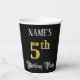 This opulent and luxurious birthday paper cup design features a personalized name and the message “5th Birthday Party”. The large number “5th” has a faux/imitation gold-inspired coloring pattern, and the words “Birthday Party” are in ornate script-style text. The background is colored black by default (although it can be customized). Fancy, elegant paper cups like this might be used at a birthday celebration/party being held to celebrate somebody’s fifth birthday. [~Z0000567]