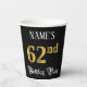 Ce design élégant et luxueux de tasse en papier sur le thème de l'anniversaire comporte un nom personnalisé et le message "62e anniversaire fête". Le grand numéro "62e" a un motif de coloriage imitation/faux d'inspiration or, les mots "fête d'anniversaire" sont en texte orné de script, et l'arrière - plan est coloré noir par défaut (bien qu'il puisse être customisé). Des gobelets en papier élégants et ornés comme celui-ci peuvent être utilisés lors d’une fête d’anniversaire ou d’une fête pour célébrer le soixante-deuxième anniversaire de quelqu’un. [~Z0000567]