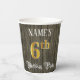 Ce design élégant et soigné de tasse de papier à thème d'anniversaire comporte un nom modifiable et le message "6e fête d'anniversaire". Le grand numéro "6th" a un motif de coloriage d'inspiration or imitation/fausse, et les mots "Birthday Party" sont dans un texte orné de style script. L'arrière - plan a un motif imitation/imitation à grains de bois. De luxueuses tasses en papier comme celle-ci pourraient être utilisées lors d’une fête d’anniversaire pour célébrer le 6e anniversaire de quelqu’un. [~Z0000568]