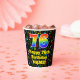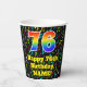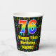 Ce design amusant et passionnant de la musique sur le thème de la tasse de papier d'anniversaire comprend un grand nombre "76" avec un dégradé arc-en-ciel inspiré motif, avec le message "Happy 76th Birthday," et un nom modifiable. L'arrière - plan est doté d'un motif multicolore de notes de musique et de symboles variés, de tailles et de couleurs variées. Des tasses de papier colorées et vibrantes comme celle-ci peuvent être amusantes à avoir lors d’une fête d’anniversaire qui a lieu pour célébrer le soixante-seizième anniversaire de quelqu’un. [~Z0000541]