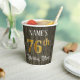 Ce design luxueux et opulent de tasse de papier d'anniversaire comporte un nom personnalisé et le message "76th Birthday Party". Le grand numéro "76th" présente un motif de coloriage imitation/faux d'inspiration or, et les mots "Birthday Party" sont dans un texte orné de style script. L'arrière - plan a un motif imitation/imitation à grains de bois. Des tasses en papier élégantes et fantaisistes comme celle-ci pourraient être utiles pour célébrer un anniversaire ou une fête célébrant le soixante-seizième anniversaire de quelqu’un. [~Z0000568]