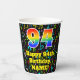 Ce design de gobelet en papier d'anniversaire à thème musical passionnant et joyeux comporte un grand nombre de "94" avec un dégradé de arc-en-ciel inspiré motif, ainsi que le message "Happy 94th Birthday," et un nom personnalisé. L'arrière - plan dispose d'un motif dynamique et coloré avec des notes de musique et des symboles de différentes tailles et couleurs. Des tasses en papier colorées et vibrantes comme celle-ci peuvent être amusantes à avoir lors d’une fête d’anniversaire ou d’une fête qui a lieu pour célébrer le 94e anniversaire de quelqu’un. [~Z0000541]