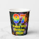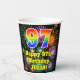 Cette conception joyeuse et excitante de tasse en papier d'anniversaire comprend un grand nombre de "97" avec un dégradé arc-en-ciel inspiré motif, avec le message "Happy 97th Birthday,", et un nom personnalisable. L'arrière - plan présente un motif animé et coloré, inspiré d'un feu d'artifice inspiré par les célébrations. Des tasses en papier colorées et vibrantes comme celle-ci peuvent être amusantes à utiliser lors d’une fête d’anniversaire qui a lieu pour honorer le quatre-vingt-dix-septième anniversaire de quelqu’un. [~Z0000539]