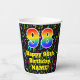 Ce design de gobelet en papier d'anniversaire à la musique joyeuse et joyeuse comporte un grand nombre de "98" ayant un motif inspiré par un gradient de spectre arc-en-ciel. Il comporte également le message "Joyeux 98ème anniversaire", et un nom personnalisé. L'arrière - plan dispose d'un motif de notes de musique colorées et de symboles. Des tasses de papier colorées et vibrantes comme celle-ci peuvent être amusantes à utiliser lors d’une fête d’anniversaire ou d’une fête qui a lieu à l’occasion du 98e anniversaire de quelqu’un. [~Z0000541]