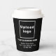 Tasse en papier personnalisable pour votre entreprise de café. Tasse en papier avec l'adresse de votre entreprise de café pour que les clients le connaissent et le trouvent facilement quand ils reviendront ou le recommandent à leurs familles ou amis. Tasse papier avec votre numéro de téléphone professionnel pour que les clients connaissent le numéro à appeler lorsqu'ils vont commander de nouveau par téléphone. La couleur de la tasse de papier est noire et la couleur de la police est blanche. Pour customiser cette tasse de papier, téléchargez votre logo d'entreprise, tapez votre nom d'entreprise ou de société, votre adresse et votre numéro de téléphone. Veuillez vérifier l'apparence sur les côtés avant et arrière après avoir téléchargé le logo et tapé des textes. Si l'apparence vous plaît, vous pouvez passer votre commande maintenant. Si vous avez besoin de redimensionner et déplacer le logo et les textes pour tenir sur cette tasse de papier, s'il vous plaît changer dans l'outil de conception. Vous pouvez également effectuer d'autres modifications selon vos préférences dans l'outil de conception, comme changer la couleur de la tasse, la couleur de la police et le style de police. Customisez-le et utilisez-le comme un matériel de marketing pour faire de la publicité pour votre entreprise, promouvoir votre marque ou sensibiliser vos clients à la marque pendant que vos clients aiment siroter le café savoureux et aromatique que vous leur avez servi.