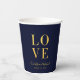 Ces gobelets en papier Amour Faux Or Bleu foncé présentent les mots "Amour" en feuille d'or faux sur un fond bleu foncé. Parfait pour les fêtes de fiançailles, les mariages et les anniversaires.