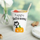 Ces drôles de tasses en papier pour enfants de la fête d'Halloween présentent un chat noir stupide et souriant assis sur le dessus d'un citrouille à lanterne de jack orange vif. Le texte dit "Happy Halloween" en lettres affligées.